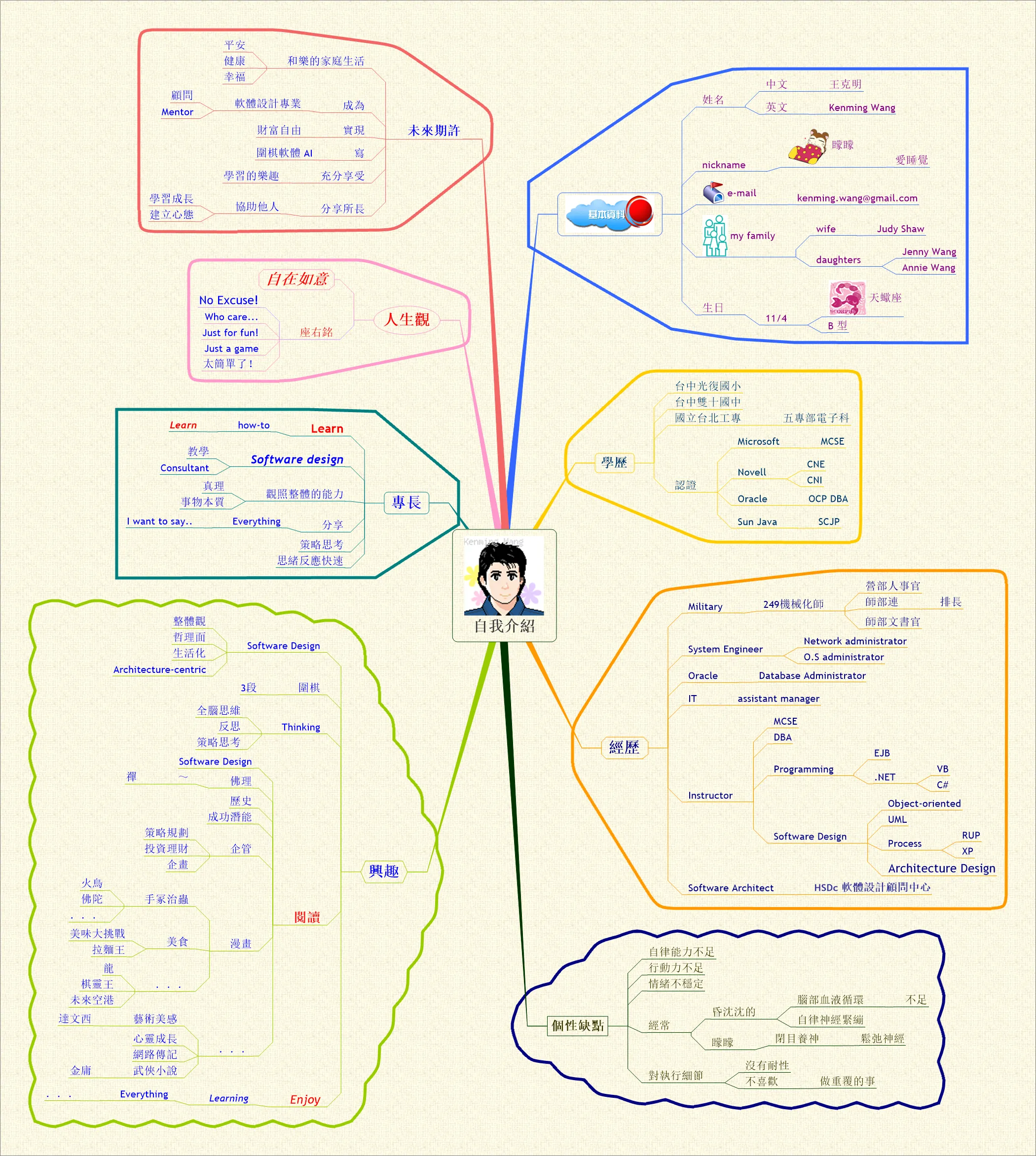 關於本人的自我介紹,先前已利用心智圖製作過。這裡再做一些修正及新增一些內容。