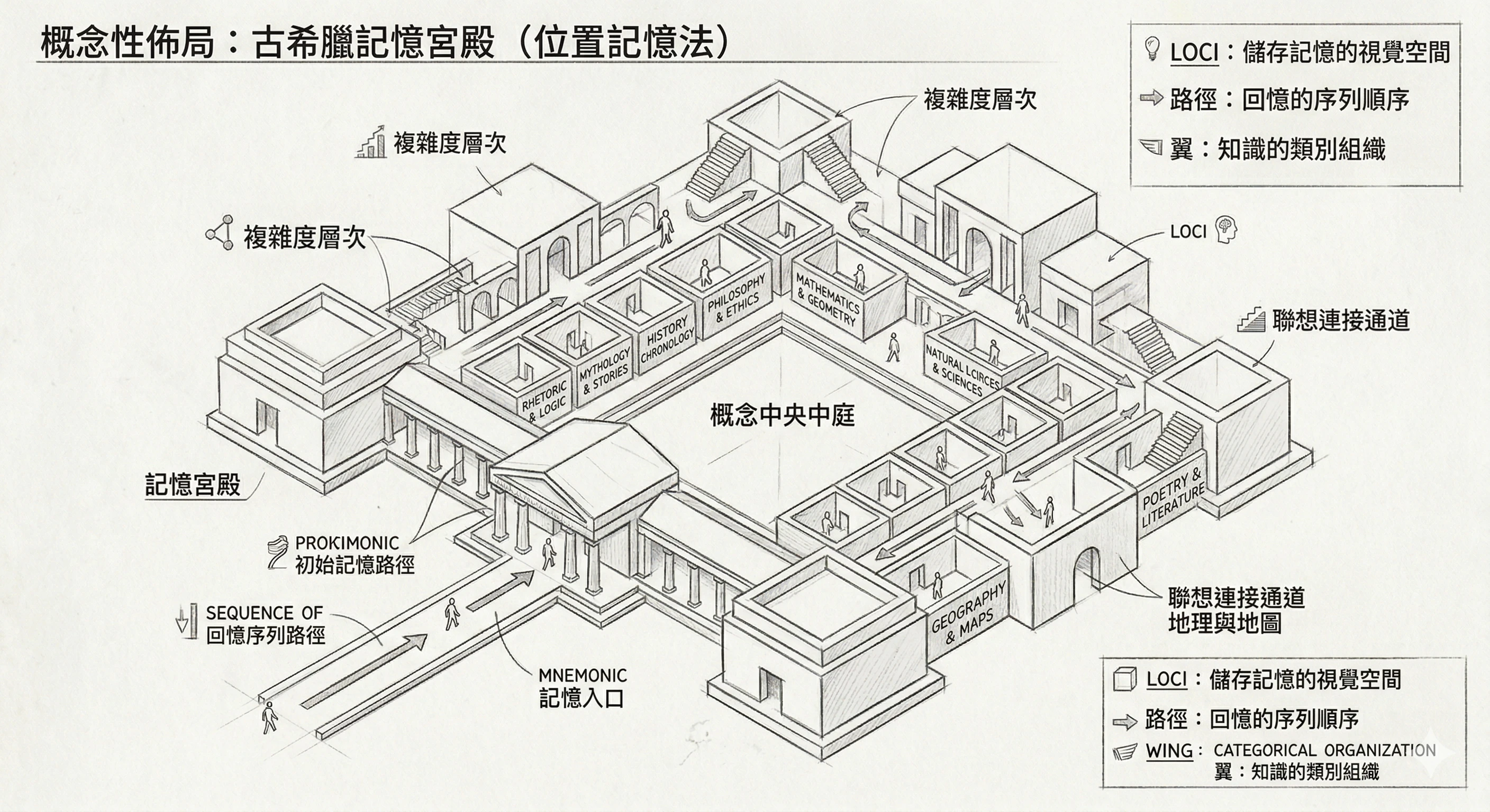 這樣的設計,其實對應到一個古老、源自希臘的記憶方法——「記憶宮殿(method of loci)」: