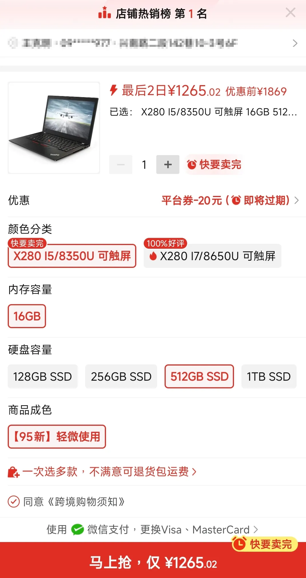 8代i5-CPU,16G RAM/512G 固態,95成新,當年可是售價高達上萬元人民幣。如今我買這台 (其實我知道這是整新機) 二手價只要 1250元人民幣,有觸屏功能,又送手提包、無線滑鼠、又免費更換了全新電池。